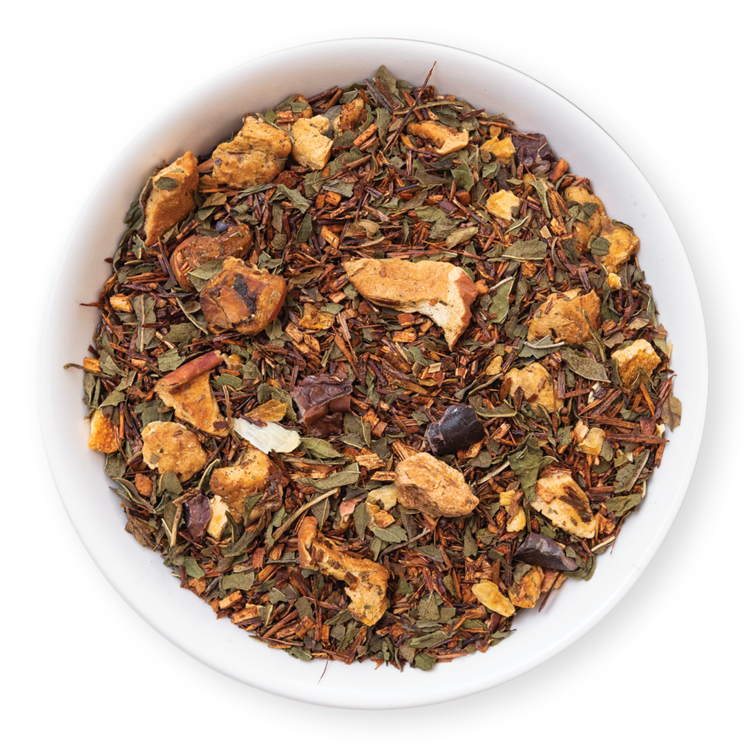 Can't decide between having a chocolate or having a mint? This rooibos blend is the best of both worlds alongside pieces of sweet apple and zesty orange peel. The result is a hot infusion of chocolatey rooibos with a bright peppermint kick. Makes a delicious tea latte.