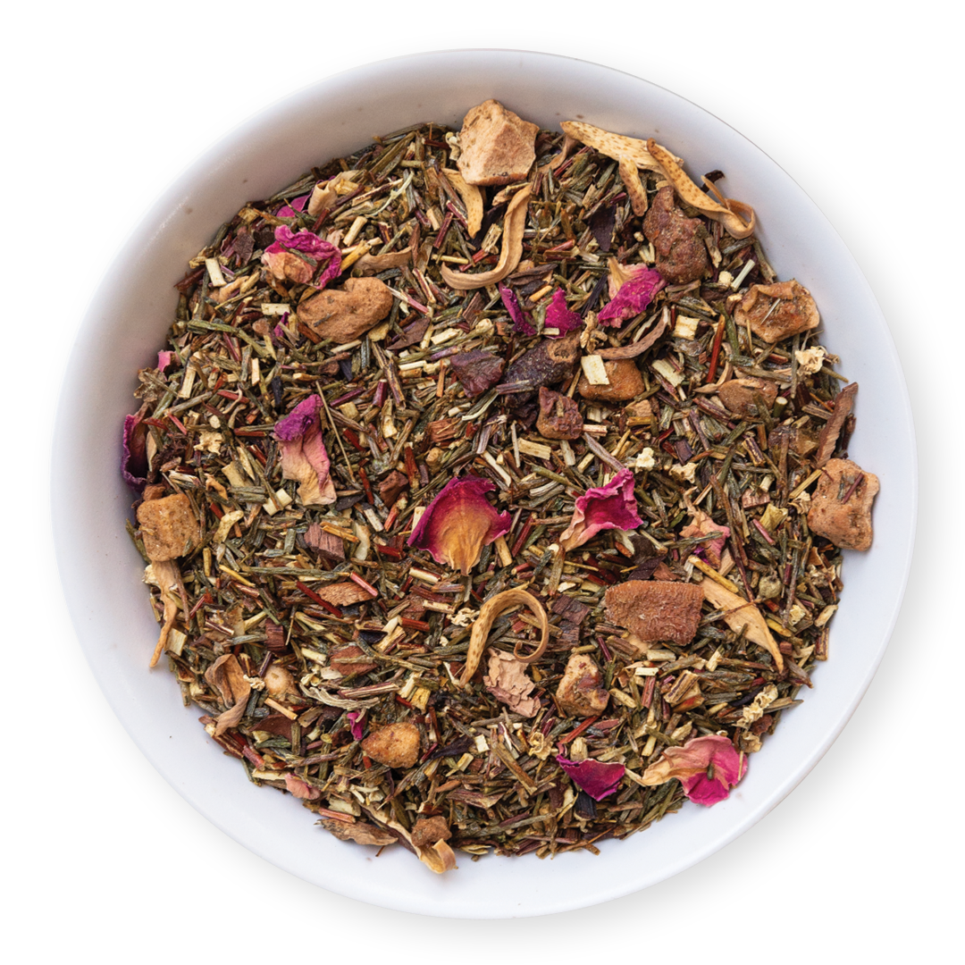 Green honey bush, green rooibos, apple, orange blossoms, rose, elderflower, strawberry, kiwi, natural flavours.