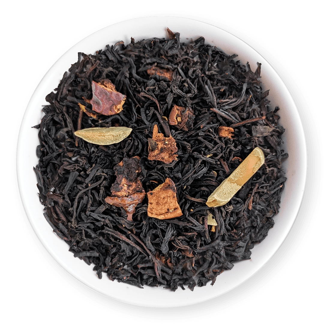 black tea, apple pieces, cinnamon, coriander, cardamom, ginger, anise, vanilla, pepper, flavouring, almond slivers.